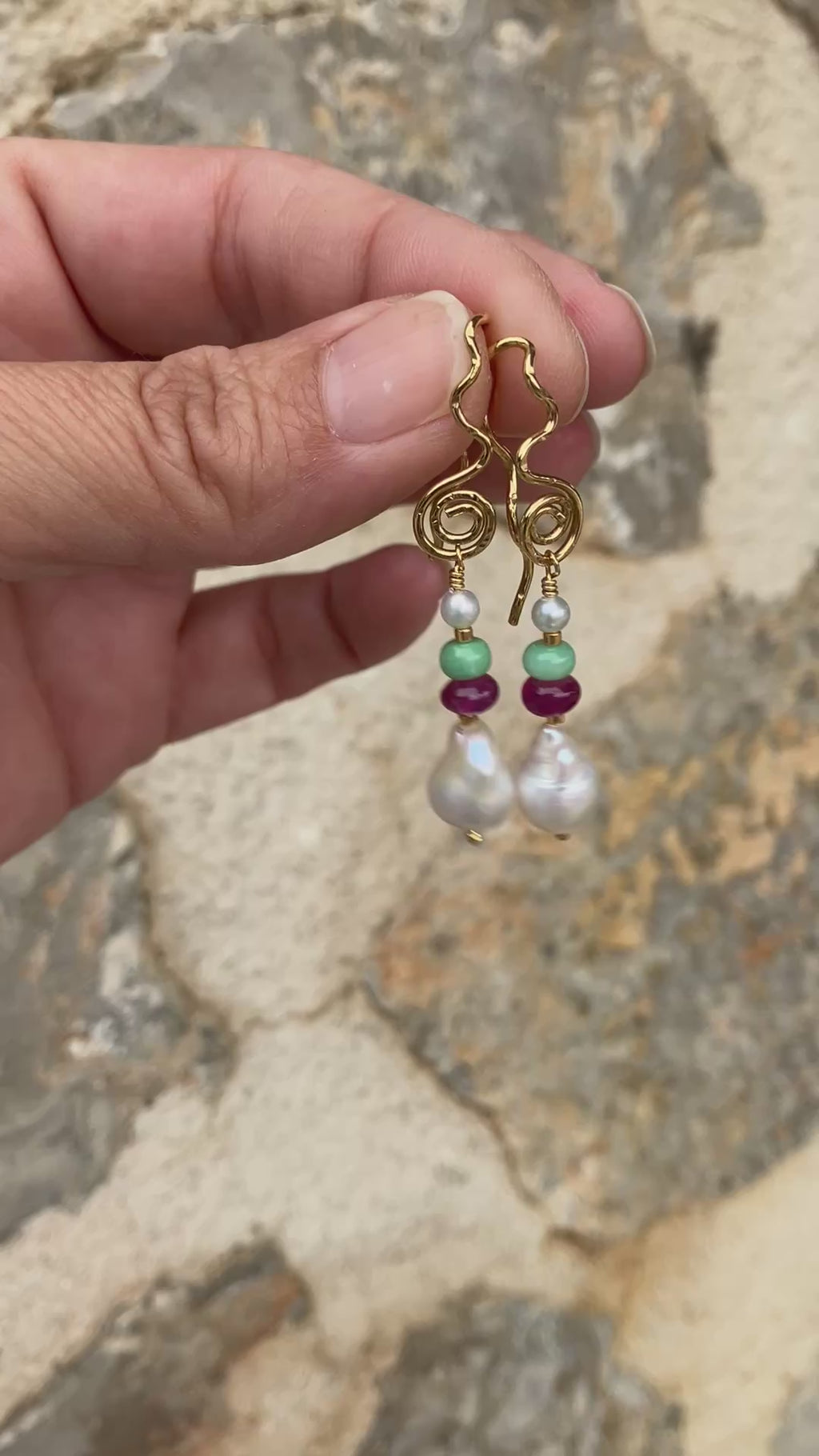 Lækre organiske ørebøjler med spiral i forgyldt 925 Sterling sølv med hvide ferskvandsperler, chrysopraser og pink safirer.